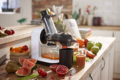Un estrattore potente, al contempo innovativo e pratico.La tecnologia gentle squeezing permette di mantenere inalterate le proprietà nutritive di tutti gli ingredienti che vorrete spremere, garantendo una estrazione fino all’80%. Particolarmente indicato per ottenere succhi dalle verdure a foglia verde. Presenta una capacità di 0,75 L per quanto riguarda la polpa; 1 L è invece la capacità del vaso, che può accogliere fino a 1 L. La praticità del cavo elettrico lungo poco più di 1 metro permette una ampia abilità nell’utilizzo dello strumento di estrazione, il tutto per un consumo di circa 140 Watt. L’estrattore è dotato di un comodo pulsante per accendere e spegnere, senza dover necessariamente staccare la spina.