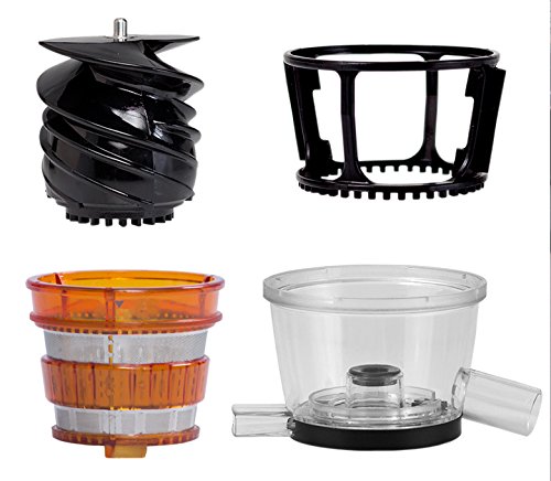 La confezione è dotata di una serie di accessori: contenitore raccolta succo e contenitore raccolta polpa, beccuccio uscita succo e beccuccio uscita scarto, filtro cestello, filtro sorbetto, supporto cestello, coperchio, pressino, spazzolino di pulizia, manuale di istruzioni, ricettario con 30 ricette sane e gustose.